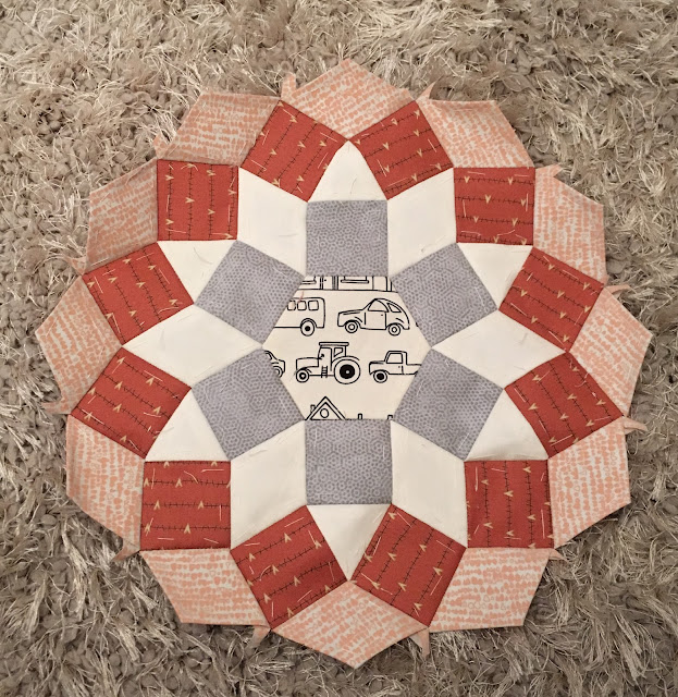 I stopped at this point, about 57" square. It's a bit of nonsense really but kept my mind occupied at a difficult time. And as I say, I have almost finished quilting - I'll show it finished next month along with the snazzy backing that I pieced from stash.