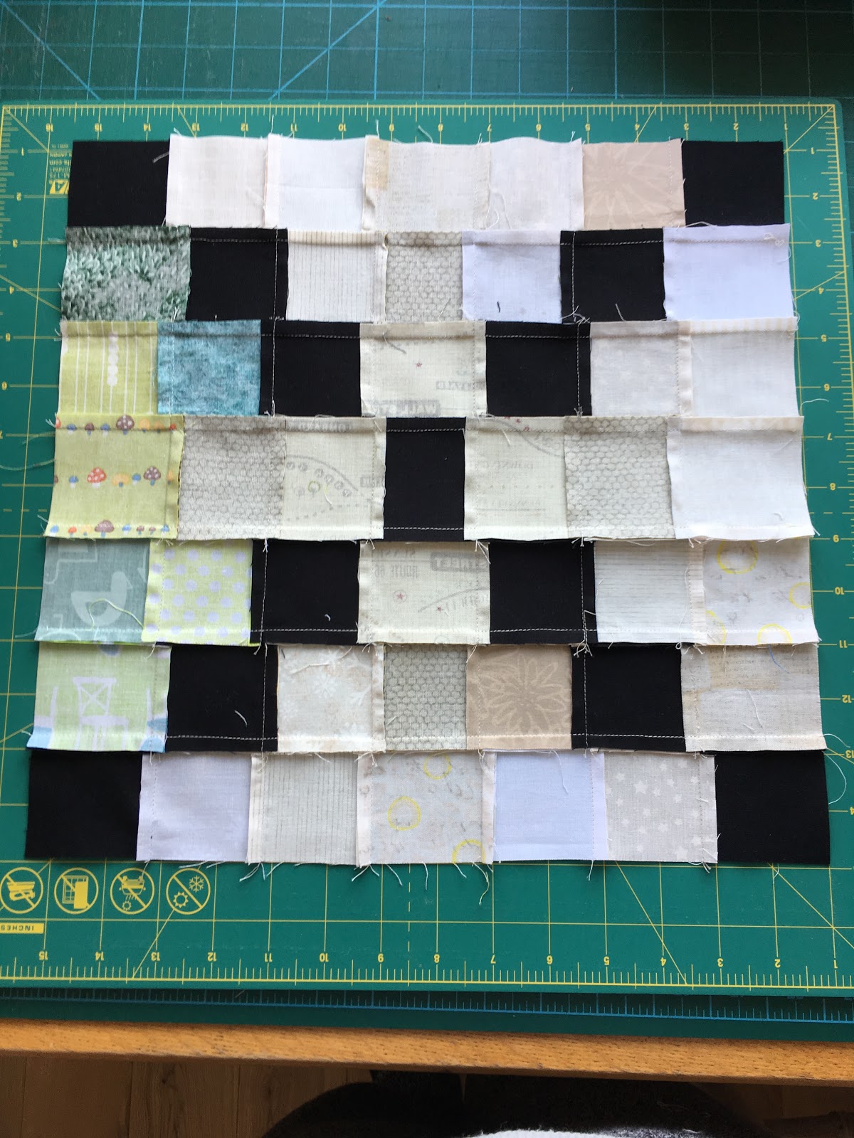 So this was my final layout of the 8" blocks but as I snowballed all the big squares I created bonus HSTs never realising they would trim down to 3" finished patches. Well I had to use them too, silly not to.